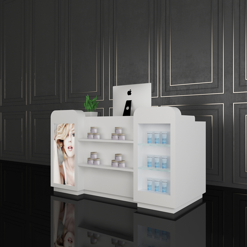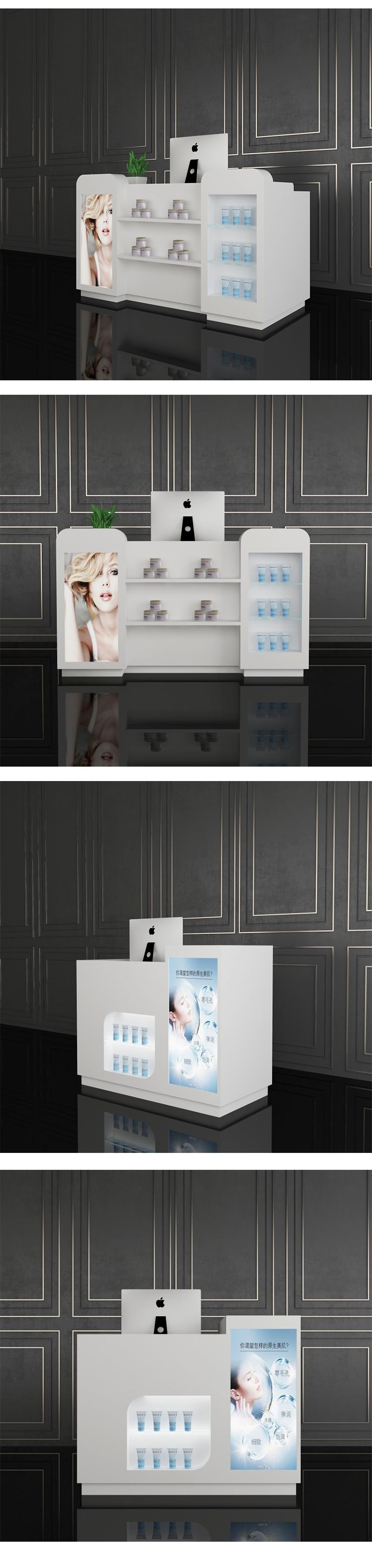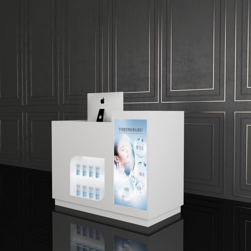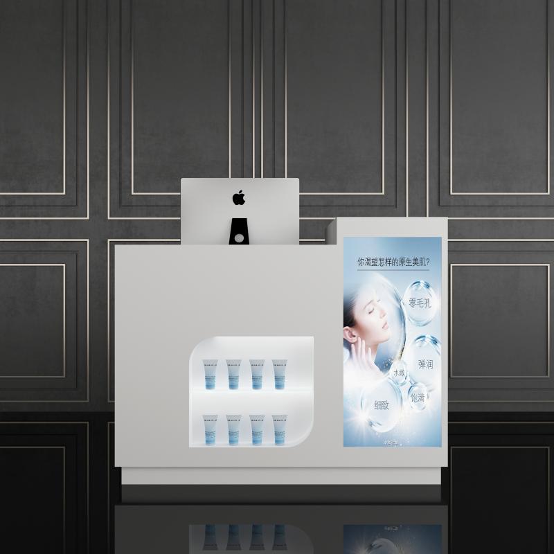 此款化妆品展柜可将化妆品等彩妆产品直观地展示给顾客,柜台上方空间大,可放其他物品,柜台侧面可张贴宣传海报。