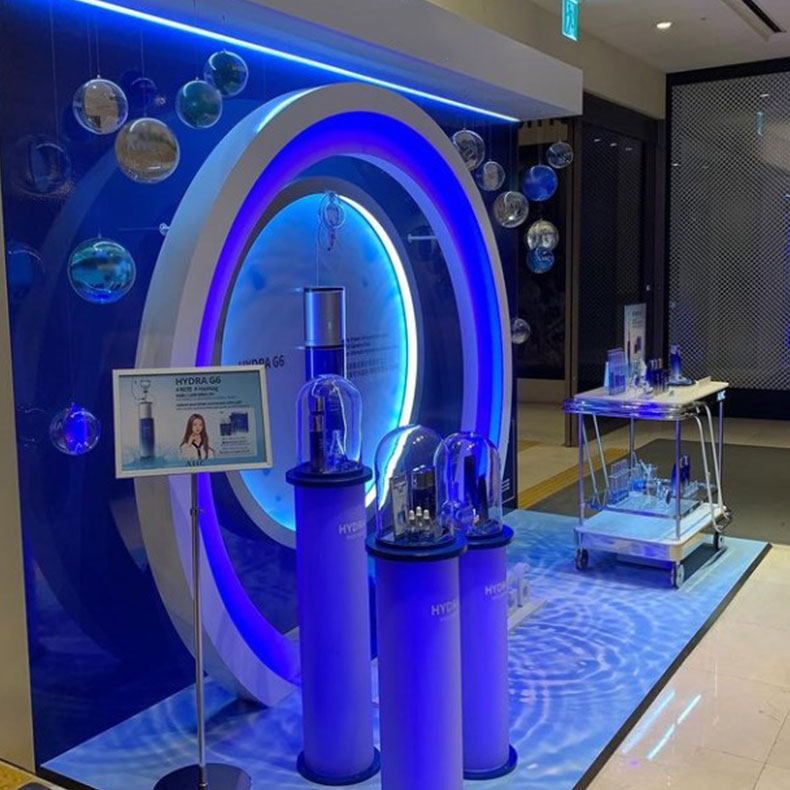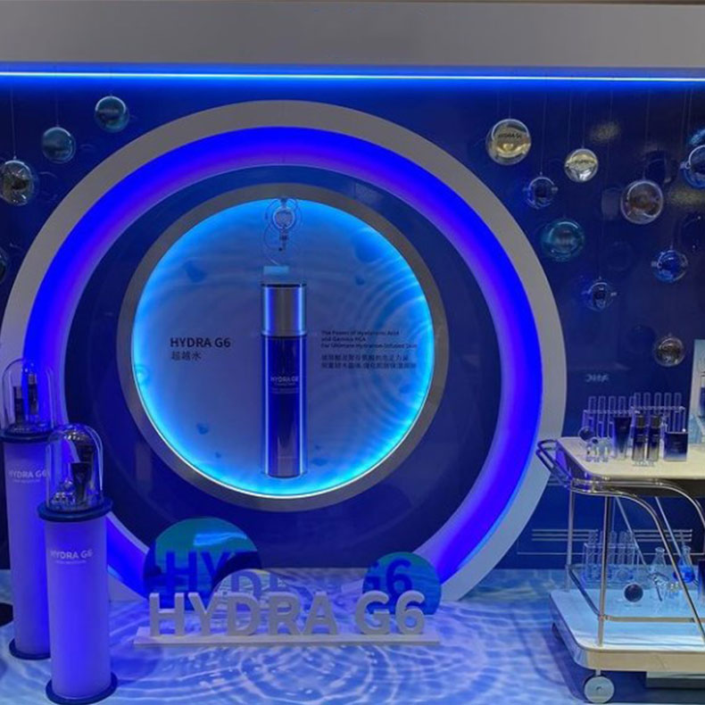 这是一款品牌定制的精美化妆品展柜,玻璃造型让消费者看清产品的同时更具设计感,紫色灯光与产品颜色的对应,让这个展柜看起来更有科技感。